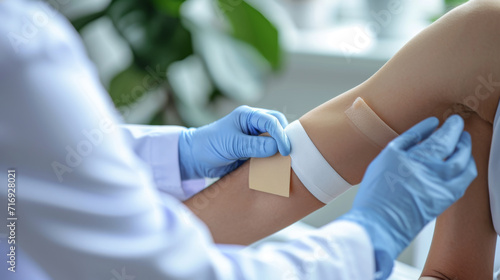 healthcare professional in blue gloves applying an adhesive bandage to someone's upper arm