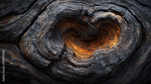 Heart-shaped knot in textured dark wood, forest background, natural design element.