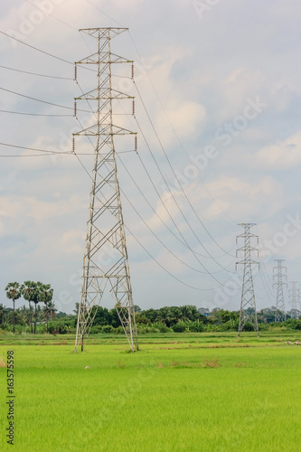 High voltage post or High voltage tower in an agricultural landscape in the Thailand. In the background are the outbuildings of a farm.