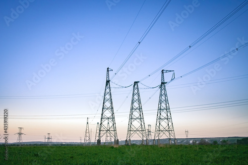 High voltage power line on industrial electricity line tower for electrification rural countryside. Energy transmisson with overhead power line