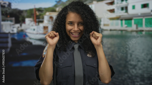 Hispanic woman police officer smiling joyfully in uniform at a seaside port with boats in the background.