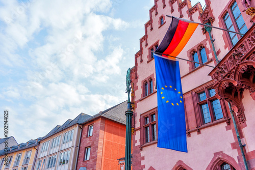 Historic Römerberg Square With Flags in Frankfurt Am Main, Germany
