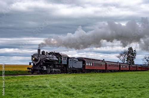 Historic Steam Train Travels Through Countryside Under Cloudy Sky. High quality photoA steam train is moving along a green field with cloud cover in the sky. The train has several passenger cars