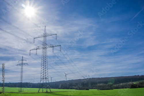 Hochspannungsleitung mit Sonne vor strahlend blauem Himmel