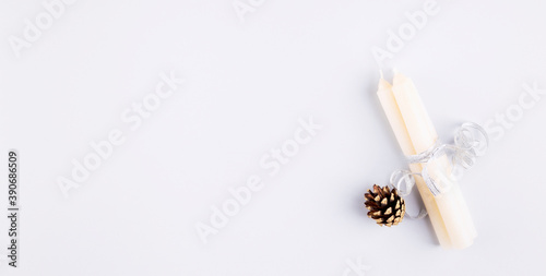 Holiday attributes. Candles with silver ribbon on gray background. Top view. Copy space