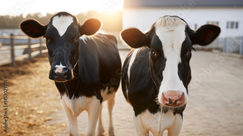 Holstein dairy cows grazing near sleek barn structure, illuminated by golden morning light