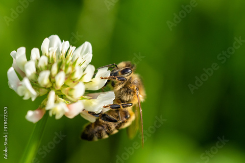 honeybee collecting pollen from a clover blossom in the garden in summertime