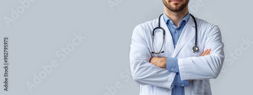 Horizontal image of doctor with hands crossed on chest with stethoscope on isolated light background with copy space. For banner, design, medical clinic, examination, World Lung Cancer Day