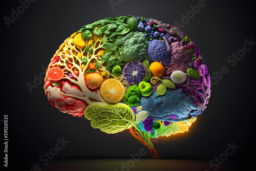 Human brain made of vegetables and healthy foods. Eco healthy brain consciousness concept. Generative AI