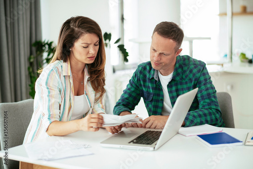 Husband and wife preparing bills to pay. Young couple having financial problems.