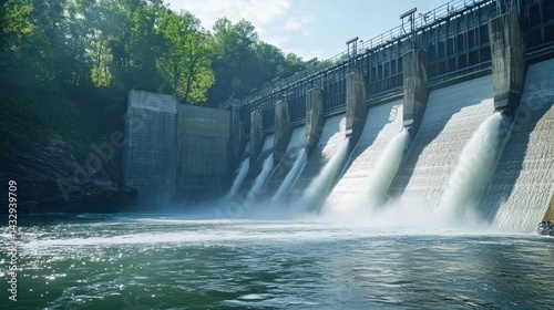 Hydroelectric dam releasing water, creating powerful cascading waterfalls.