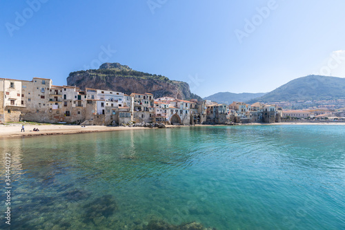 Idyllic view of turquoise sea and houses with Rocca di Cefalu rocky mountain in the background seen from historical old port of Cefalu, Sicily, Italy.