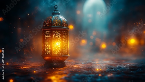 Illuminated Lantern on Misty Surface with Bokeh Light Background
