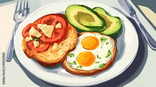 Illustrated Breakfast Plate with Avocado, Sunny-Side-Up Eggs, and Tomato Toast