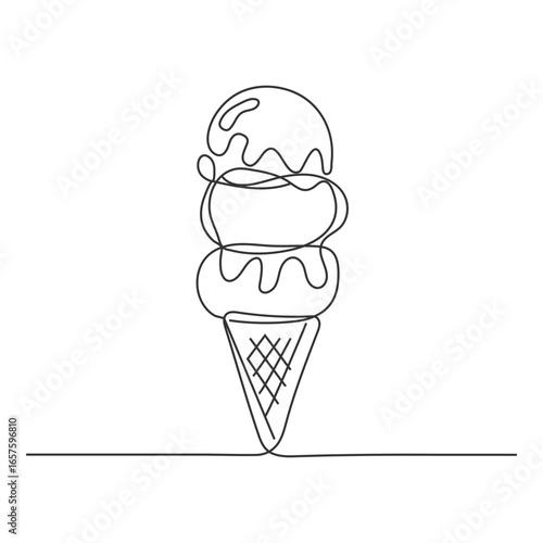 Illustration of a double scoop ice cream cone with sprinkles in black and white line drawing style art.