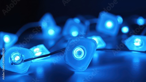 Illustration of closeup of a string of blue led lights glowing in the dark for decoration