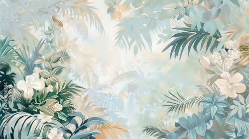 Illustration of tropical wallpaper print design with palm leaves, monstera leaves, birds and texture. Exotic plants and birds on textured background. AI generated illustration