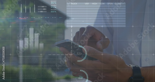 Image of financial data and graphs over hands of african american man using smartphone