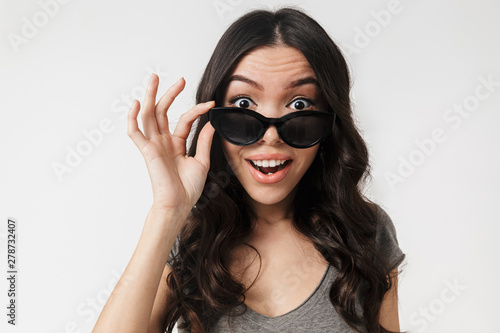 Image of positive brunette woman 20s dressed in basic clothes smiling and holding sunglasses