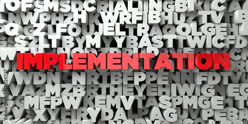 IMPLEMENTATION - Red text on typography background - 3D rendered royalty free stock image. This image can be used for an online website banner ad or a print postcard.