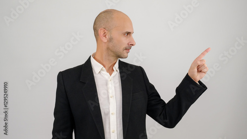 In a studio setting, a middle-aged businessman wearing a suit is standing in front of a white background, pointing to the corners with his index finger and looking at the camera