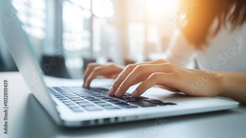 In a well-lit office, an individual concentrates on typing on a laptop keyboard, highlighting a moment of productivity and creativity in a modern workspace