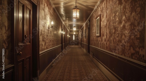 In this stock image, you can see an empty hallway with a classic hotel corridor background.