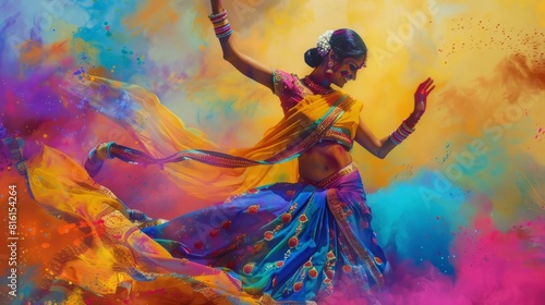 Indian woman in vibrant dress dancing celebrate Indian Holi Festival hyper realistic