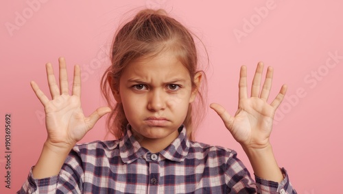 Indignant girl in checkered shirt raises hands in disbelief, showing disappointment, against a pink background