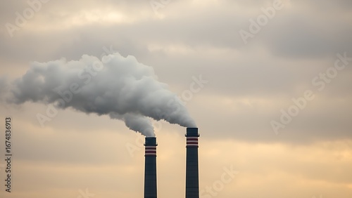 Industrial smokestacks releasing vapor into a cloudy sky, conveying an environmental message with muted tones.