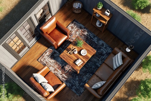 Innovative 3D Visualization of Rustic Home Overhead View of Cozy Living Room with Leather Armchair and Wooden Coffee Table