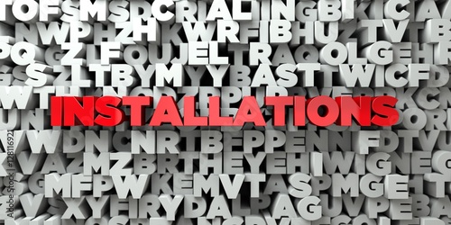 INSTALLATIONS - Red text on typography background - 3D rendered royalty free stock image. This image can be used for an online website banner ad or a print postcard.