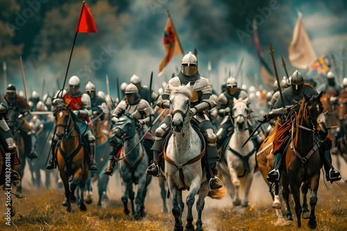 Intense medieval battle with cavalry and foot soldiers in plate armor