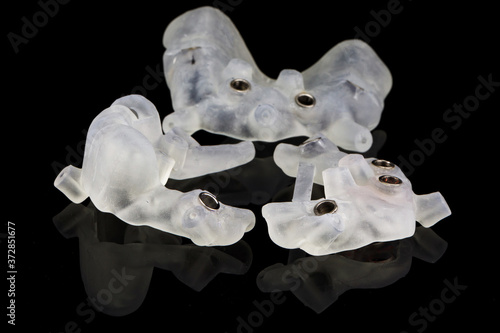 interesting composition of laid out surgical templates, filmed on black glass with creative reflection