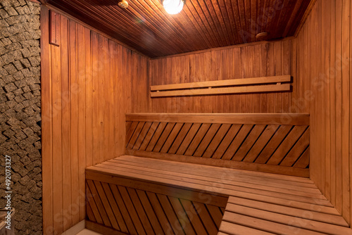 interior of empty dry finnish and russian sauna bath