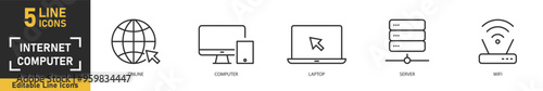 Internet and Computer line icon set. Set of 5 outline icons related to online, computer, laptop, server, wifi and more. Vector illustration.