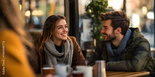 Intimate Cafe Moment: A captivating couple shares an engaging conversation at a cozy cafe, bathed in natural light, radiating warmth and connection.