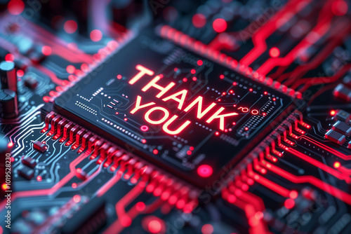 Intricate Circuit Board Design with Vibrant Red Illumination and 'Thank You' Message