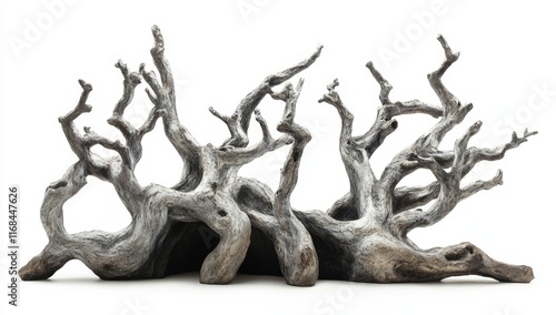 Intricate, grey driftwood piece isolated on white background.