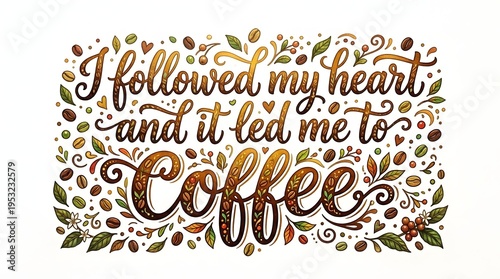 Intricate hand-lettered quote 'I followed my heart and it led me to coffee' surrounded by decorative coffee beans and leaves, in warm brown and green tones.