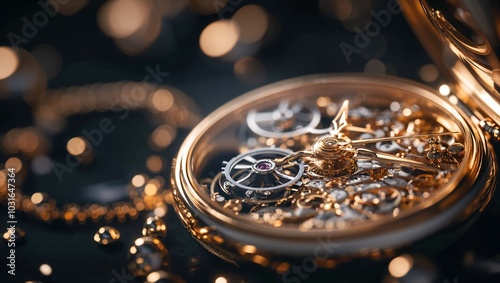 Intricately Designed Golden Pocket Watch Surrounded by Delicate Lights, Celebrating the Elegance of Timekeeping Craftsmanship in a Mystical Atmosphere of Nostalgia.