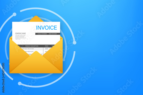 Invoice icon vector. Email message received with bill document, flat style open envelope with invoice paper blank.