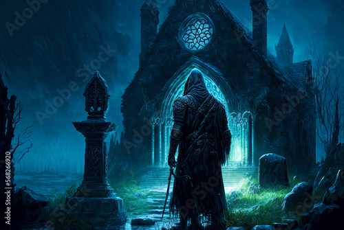 Irish landscape, man in cemetery at night, glowing church, fantasy. Generative AI