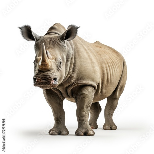 Isolated adult rhinoceros standing on a white background, full body front view.