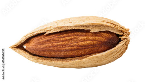 Isolated delicious raw whole almond nut with cracked open shell as healthy ingredient