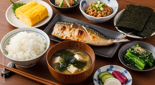 Japanese breakfast. traditional japanese food including rice, miso soup, fish and side dishes