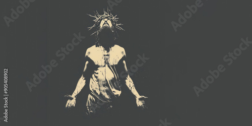Jesus Christ with crown of thorns on his head in prayerful pose, black background. Vector illustration.
