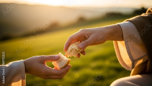 Jesus sharing bread with another person and distributing it to the people. The religious concept of communion and blessing at Easter. An event symbolizing the festival of kindness.