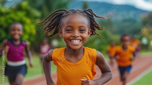 Joyful african child running in race outdoors with friends