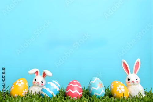 Joyful Easter Celebrations: Festive Eggs and Bunny Decor on a Blue Background - A Vibrant Holiday Greeting